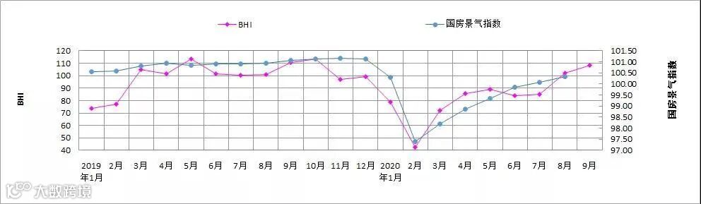 图1:2019年1月-2020年9月BHI与国房景气指数对比图