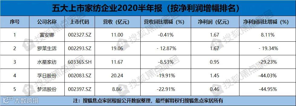 截止9月15日,富安娜、罗莱生活、梦洁股份、孚日股份和水星家纺共5家家纺企业发布2020年半年报。