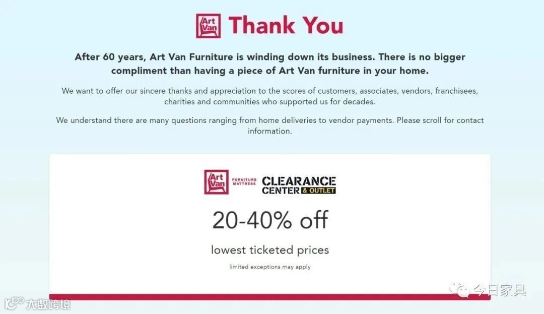 ▲ArtVan Furniture官方网站已经宣告公司停止运营,截图于3月18日