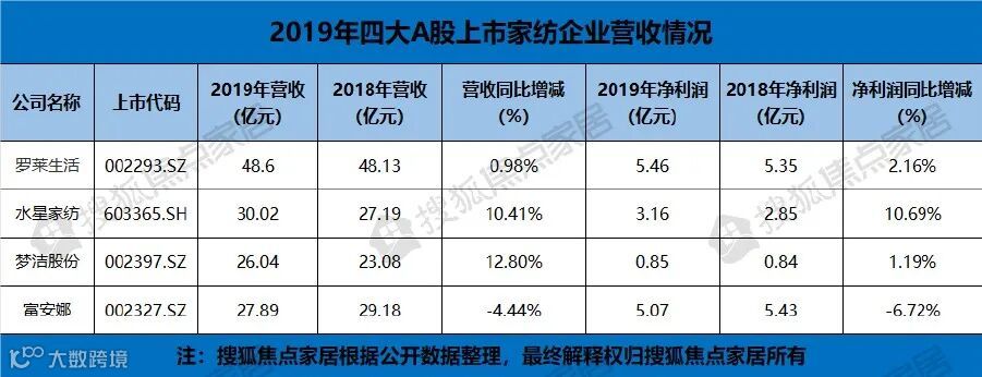 日前,各大上市公司已陆续发布2019年业绩情况。截至目前,家纺行业除了尚未发布2019年财报的孚日股份外,罗莱生活、梦洁股份、水星家纺和富安娜均已发布2019年报。搜狐焦点家居统计,四家家纺行业上市公司2019年净利润共计14.54亿元,同比增长0.48%,业绩增速明显收窄。