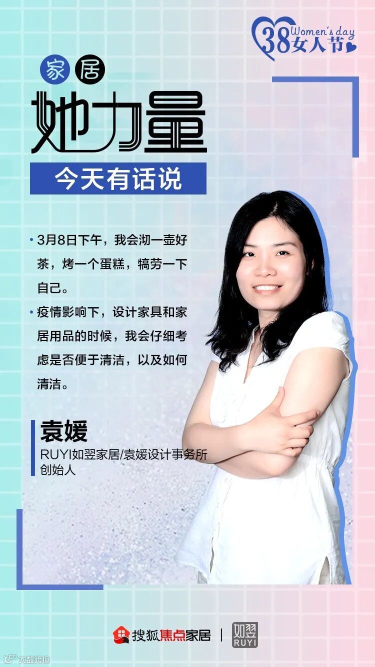 袁媛,RUYI如翌家居/袁媛设计事务所创始人,其言语如其作品,始终在向生活本身靠拢,其曾说过“好的设计对社会有促进作用”。她认为,此次疫情对家居设计最直观的影响是:设计家具或其它家居用品的时候,设计师会将“是否便于清洁,以及如何清洁”的因素考虑进去。