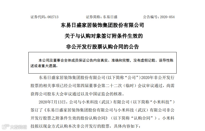 7月13日晚间,东易日盛(002713.SZ)发布公告,2020年7月13日东易日盛与小米科技(武汉)有限公司签订了《东易日盛家居装饰集团股份有限公司与小米科技(武汉)有限公司非公开发行股票之附条件生效的股份认购合同》。认购总价款=认购数量×认购价格,认购总价款为不超过人民币13,403.11万元(含本数)。