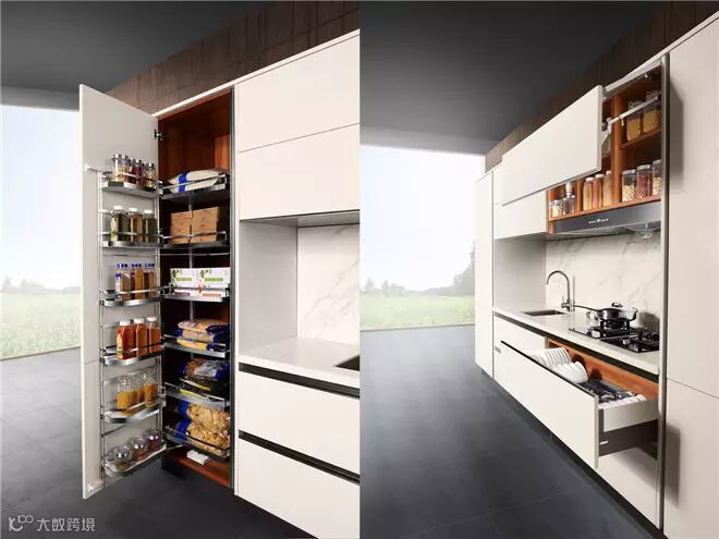 此外,自2008年开始,在西曼系列中就已出现了进口橱柜五金和功能五金的身影,发展到现在的C3,不难发现专攻橱柜死角收纳的转角拉篮、可以完整收纳瓶瓶罐罐的中式定制调味拉篮、可承重120KG的联动拉篮、方便高柜使用的下拉拉篮……这也奠定了金牌厨柜这一经典系列产品利用五金提高橱柜空间利用率的基调。而在提供这一厨房收纳解决方案的合作名单里,我们亦看到这些鼎鼎大名的经典品牌:奥地利百隆Blum、德国凯斯宝玛KESSEBOHMER、意大利莫比克兰MOBIL CLAN、 德国豪迈homag ,以色列恺萨金石 CaesarStone等。