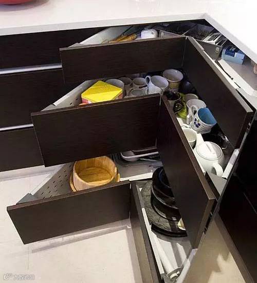 1、将拉篮设计成了斜角的插入式。有效避免转角空间的浪费。
