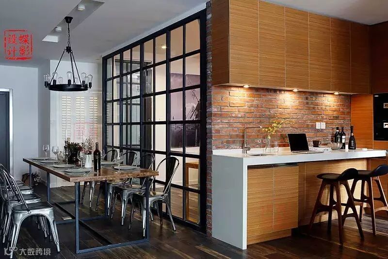 餐厅后面的书房原结构是没有采光的暗室,只能用作储物间,设计师把房间扩大,用玻璃隔断作为分割,让它和整个空间融为一体。餐厅区域铁皮椅、铁艺吊灯、黑色玻璃隔断、以及木质大餐桌到处都散发着工业的气息。
