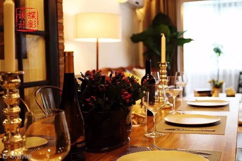 工业风格硬朗的餐厅用鲜花、美酒、烛台装扮后,在暖色灯光的映衬下增添了几许浪漫格调。