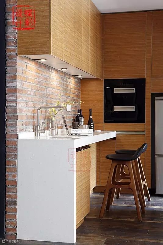 开放的吧台区域有效的与厨房油烟区分开,这里是家人在一起共享早餐的地方。裸露的红砖墙搭配木色柜体,柜体上细致的纹理在粗旷中增添细腻。
