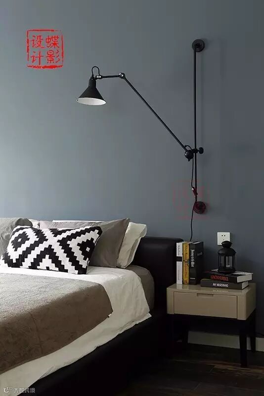 沉静深邃的深灰色卧室没有过多的装饰,整个空间都尤为简洁,只有床头的两个大摇臂铁艺灯在简洁中彰显着它独特的个性。