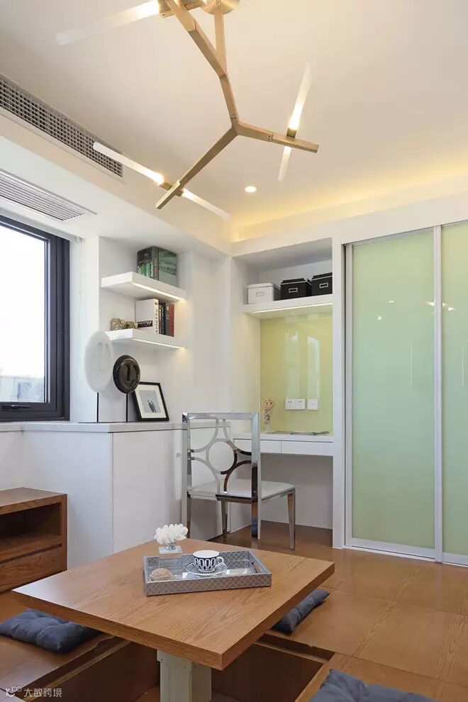 一层茶室区具备了多种功能性,白天可将电动桌升起,为家庭生活提供了休闲品茶区,并且利用了地台的高度,在茶室周边范围设计了地柜,用作起居被褥等物件的收纳。