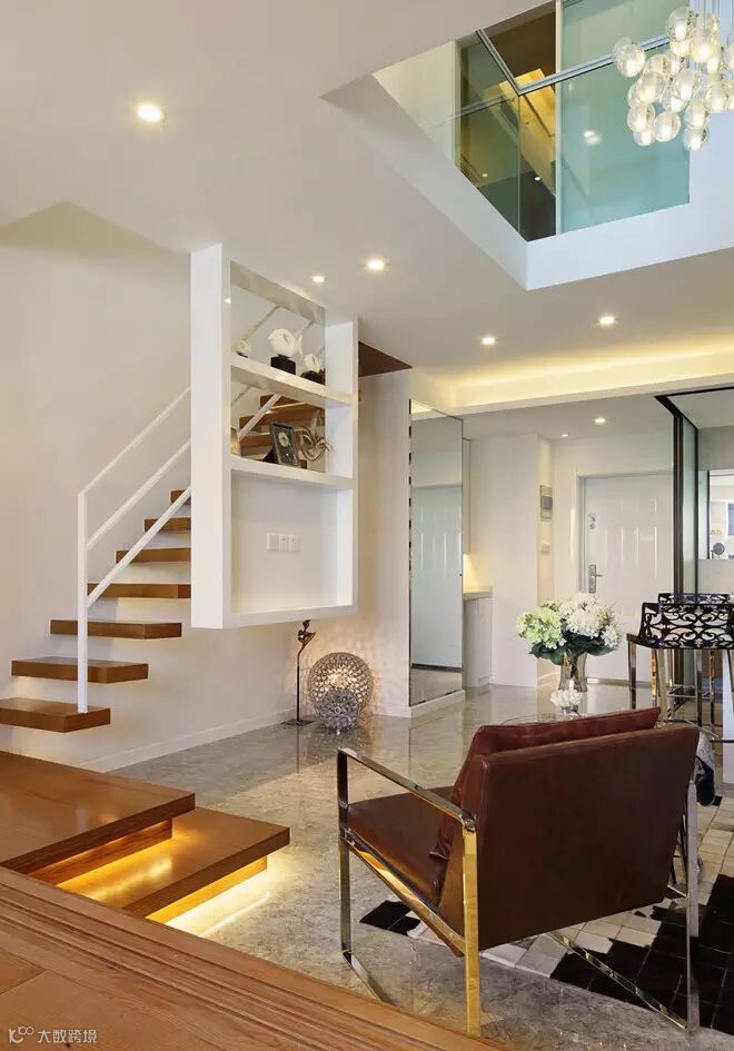 二层对楼梯进行悬挑设计,使楼梯空间得以视觉体量的弱化,又增强了视觉的美感,悬挂的电视架也是打破传统概念,将空间的每个组成部分变得轻盈与纯粹
