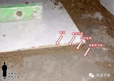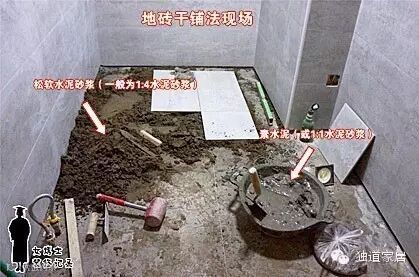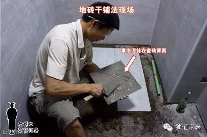 孙工最开始质疑这类防水做法,起自对垫层内积水的关注。垫层就是指地砖干铺法时最下面那层松软的水泥砂浆层(干铺法是先松软水泥砂浆垫底、然后将瓷砖背面抹上素水泥覆盖其上,再用橡皮锤校正平整和位置):