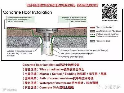 ▲由上图可见,国外早就注意到了垫层内积水问题,因此都画出了积水流动通道,要求垫层内的水能自然渗入地漏处下水管中。也就是说,要求防水层具有一定坡度,其坡度要求能引导积水流入地漏下水口中。