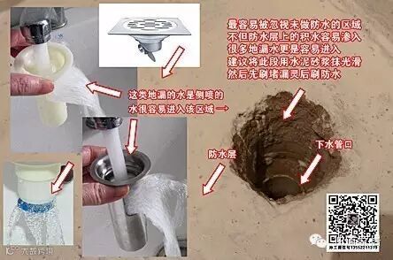 3、防水材料要覆盖住最低点处地漏下水管边缘,并延伸进地漏下水管内,以防水进入防水层下或下水管与砂浆之间的缝隙内。尤其是有的地漏下水管口低于砂浆找平层时,更要注意这段凹陷处周围的防水处理。这段如果不处理,将来垫层积水及部分形式地漏内的水,很容易通过这段未做防水的区域进入,导致楼下渗水!因此,孙工建议将此段用水泥砂浆抹光滑后,先刷堵漏灵,后刷防水。