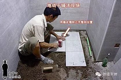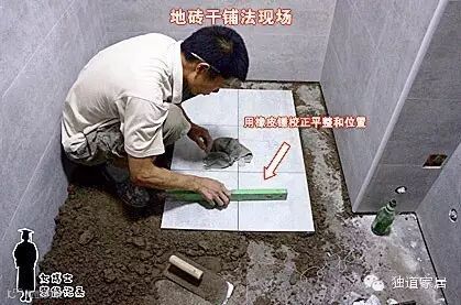 地面简单处理(地面扫除干净,然后用水泥将有坑的或有缝的地方修补下)→刷上防水(黑的白的什么材料的都有,厚薄不一,一般当天刷完)→闭水实验(基本连门槛的防水堤坝都不做,也就是将地面倒满水)→保护砂浆(在防水层上抹点加胶的水泥砂浆,即拉毛又保护)→干铺法铺地砖→OK!
