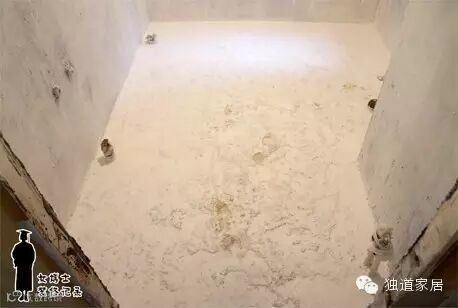 ▼再看看下面这个卫生间,地面也是如此,工人很积极地做完了地面防水处理,但这地面明显不平整啊,而且低洼处明显不是下水管口处啊。将来干铺法铺砖,肯定也有垫层积水问题!