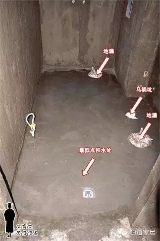 那现在就简单了:我们只需要在做防水前进行地面找平,同时注意所有阴角做成弧形,让找平后的地面成一定坡度,最低点在某地漏下水口处,然后再做防水层处理。