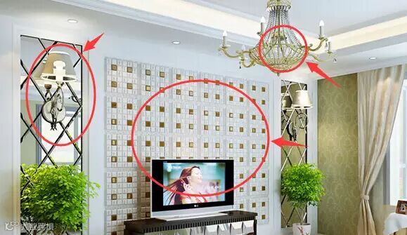 上图把对称的壁灯,以及软包背景墙还有水晶吊灯都@了出来。一般一个筒灯的价格在几十到几百,如果将这部分银子省下,最好在客厅区域选择一个集中的光源。