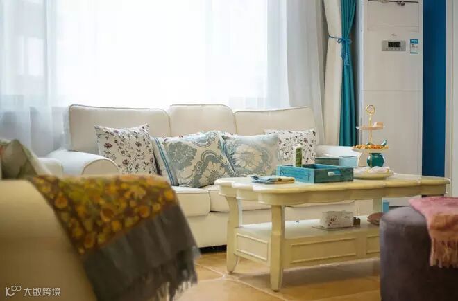 浅色沙发搭配不同碎花抱枕勾勒出温馨舒适的居家感受,欧式风情茶几和美丽的摆盘让人忍不住作视觉停留。