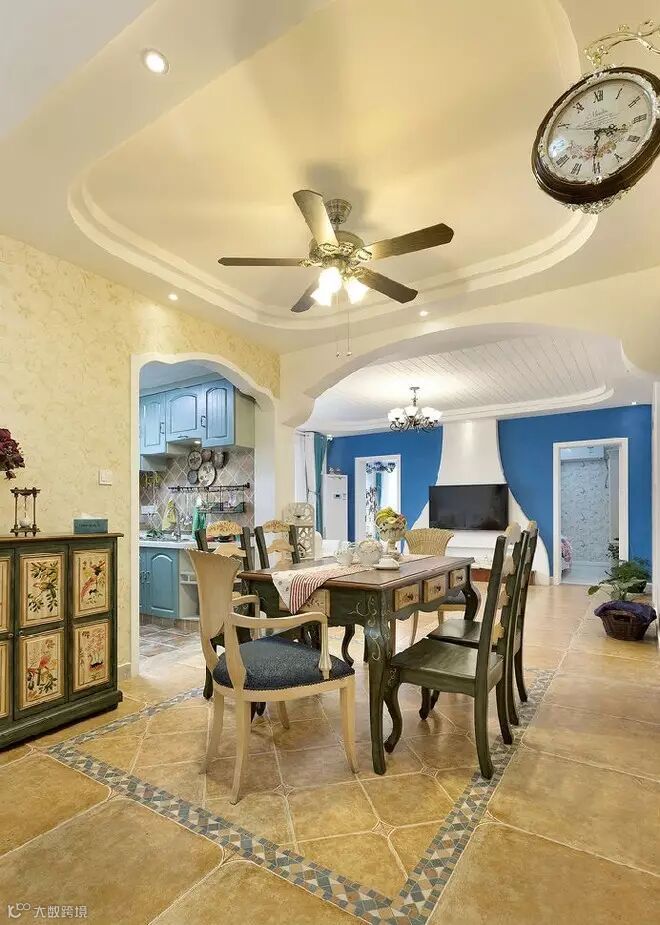 餐厅的天际以弧形线板勾勒出大气祥和,一把吊扇复古精致地带出地中海韵味。
