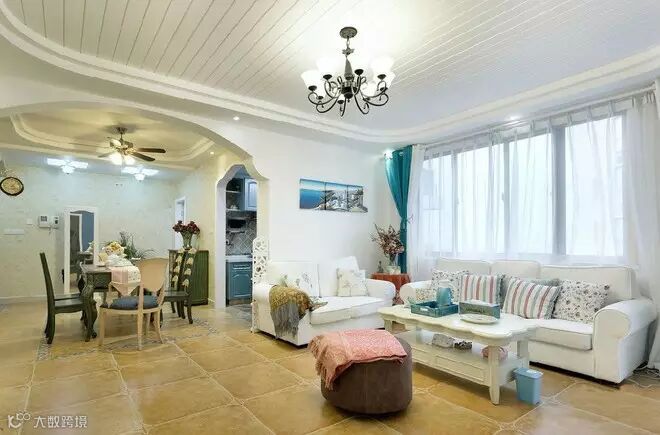 地中海风格少不了蓝色元素的点缀,电视背墙的立体弧形线板仿佛抹去了岁月棱角,能有安抚宁静之感,同时丰富了整个客厅视觉感受。