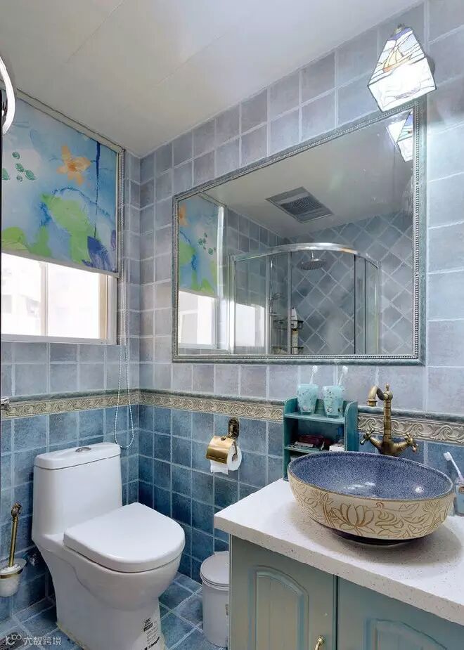 卫浴室以蓝色瓷砖塑造海洋风情,复古金属铜水龙头更是一道美妙的点缀。