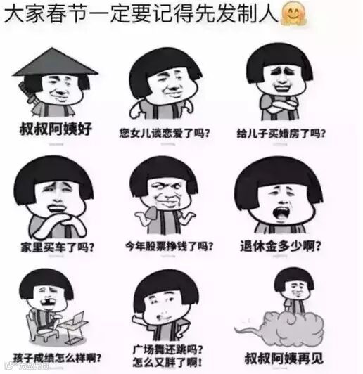 话说过年也有例行的“几件套”——吃喝,躺尸,拜年,被逼婚。其中,又以逼婚杀伤力最大。很多单身贵族们面对春节回家过年,七大姑八大姨扑面而来的个人问题,甚是恐慌与疲倦。于是乎,不少小编们急中生智,给各位即将过年的小主们送上了一系列的妙招。这个版本大致如下:
