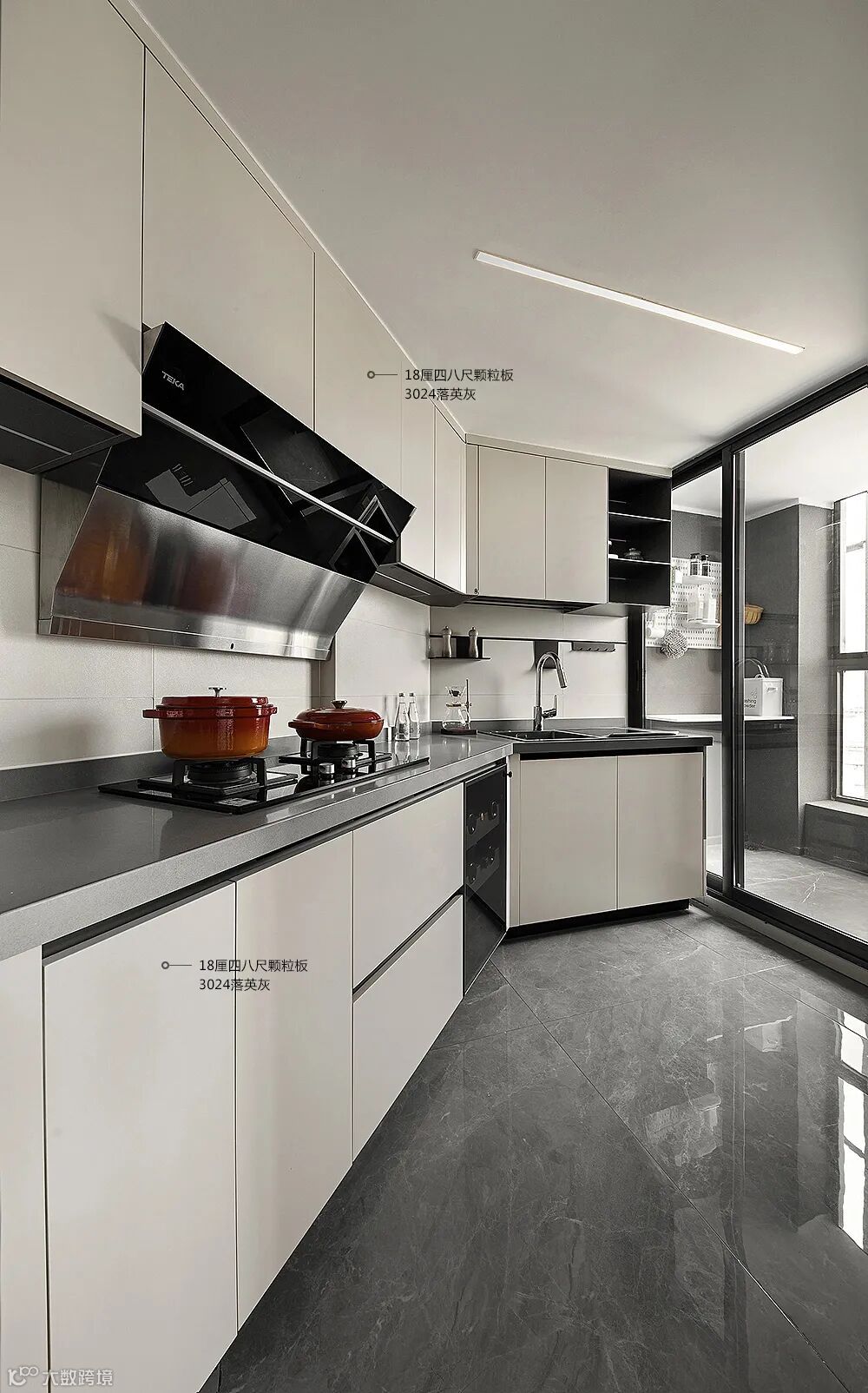 厨房延续客厅的轻奢简约风格,简洁大气的设计手法,没有浮夸的造型,没有丰富的色彩叠加,3024落英灰高低橱柜搭配,和谐统一,注重品质与设计感,精心的材质搭配,考究的烹饪用具,无疑体现了对生活品质的追求,所有微乎其微的细节处理都流露出精致的生活情调。