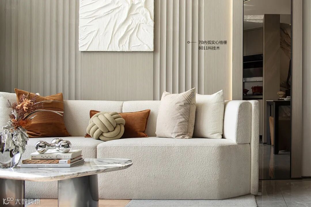 对面是客厅的沙发墙,设计师巧用浅灰色的科技木木饰面大板+内弧格栅,配上写意风格的装饰画,比单纯的只刷漆要有质感、上档次多啦!