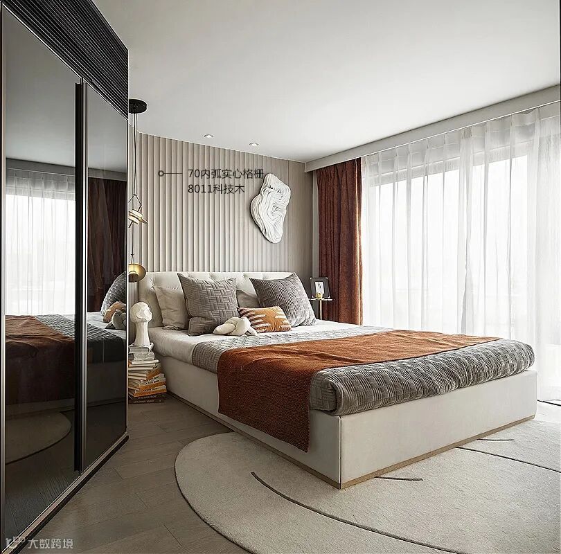 卧室空间设计简洁不随意,高级却不浮夸,摒弃繁复的造型和丰富色彩搭配,科技木质感的内弧格栅做床头背景墙,给人带来轻松舒适、温馨大气的感觉,配上玻璃柜门,每一个看似简单的设计背后,让人在视觉和心灵上享受到双重的震撼,亦是一种极致优雅生活态度的表现。