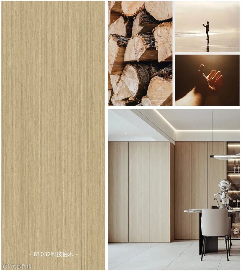 81032科技柚木:简单干净、温暖质朴的科技柚木木饰面,抚慰现代人忙碌的身心。温润细腻木线纹理,细长竖直的直线给人较强的生活自持感,非凡气质成就公共装饰空间和家居空间的优异之选。
