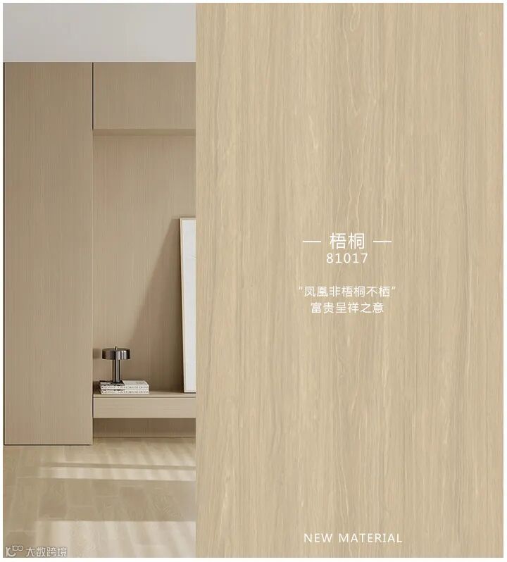81017梧桐,接近原木的浅木色与紧密的山纹和谐共融,视觉柔和,触感细腻;自带迷人的复古情韵;轻盈灵动的线条营造微妙的动感,轻柔的用色又化解了线条带来的紧张感,契合现代居室的审美。