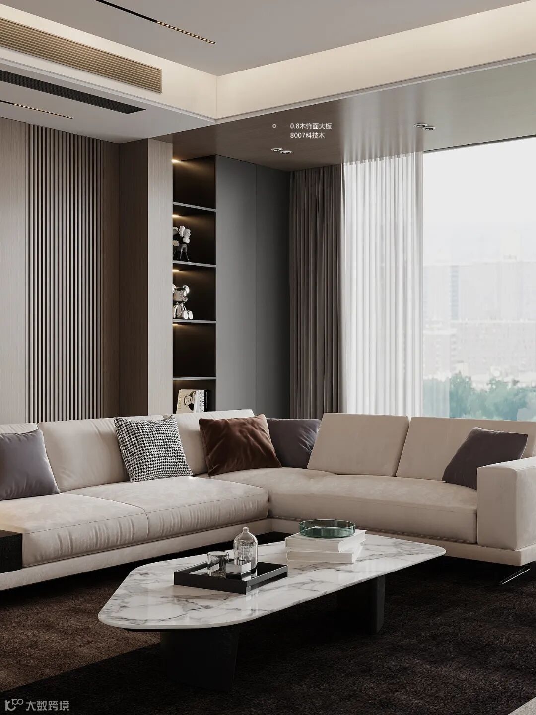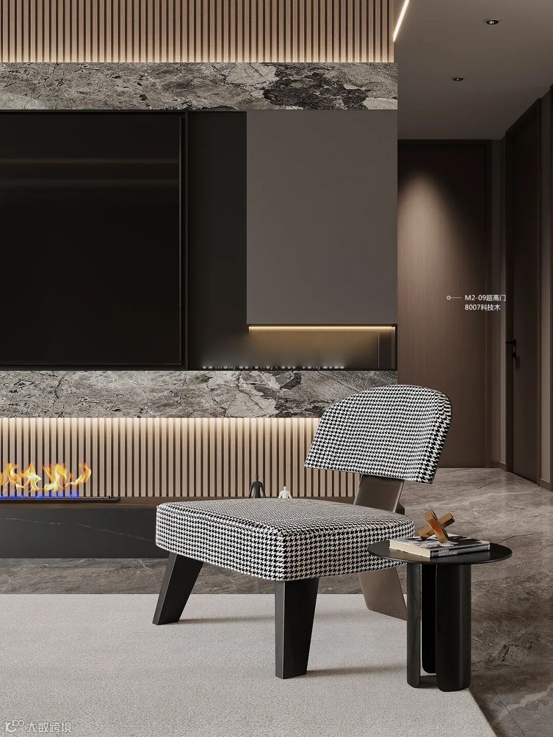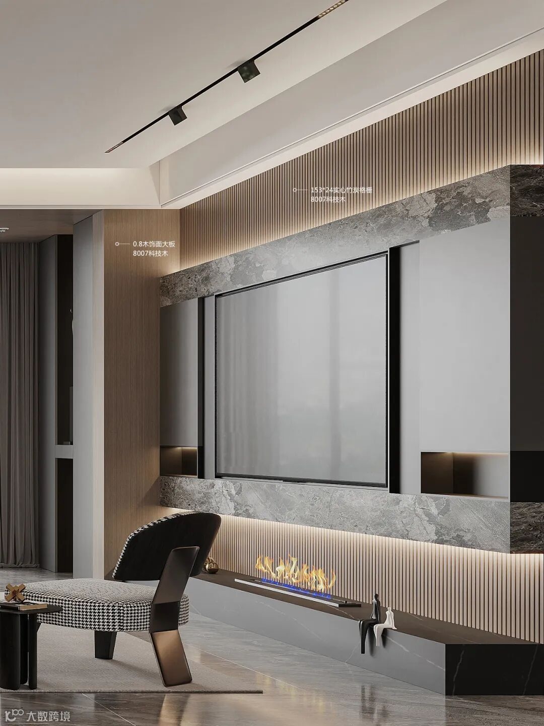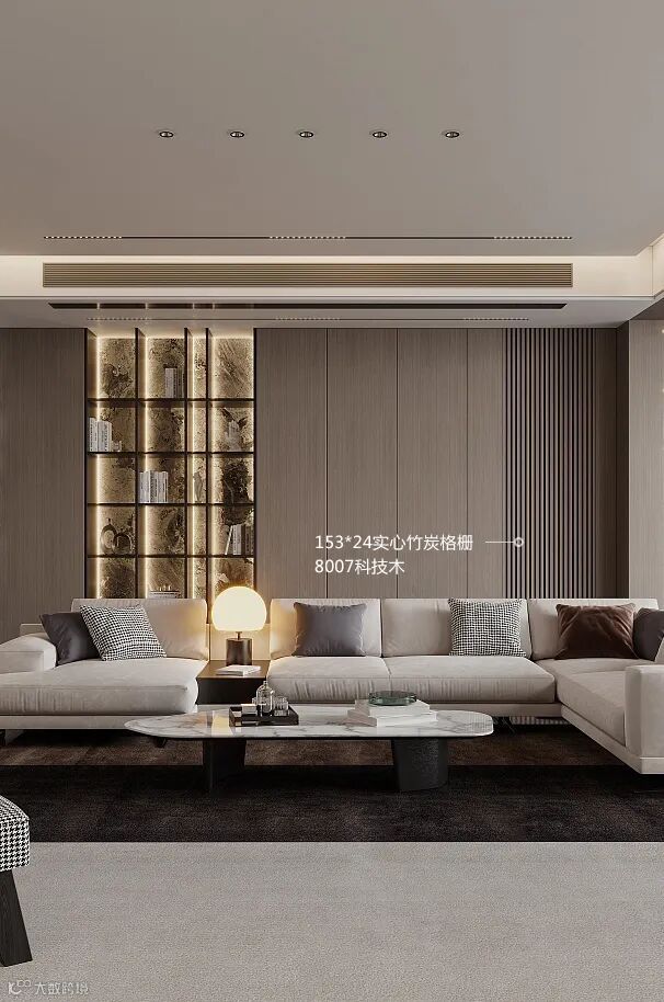 电视背景墙,8007科技木153*24实心竹炭格栅打底,线条优美,优雅整洁,具有强烈的线条设计感。整体空间低调含蓄,凸显奢华设计感。