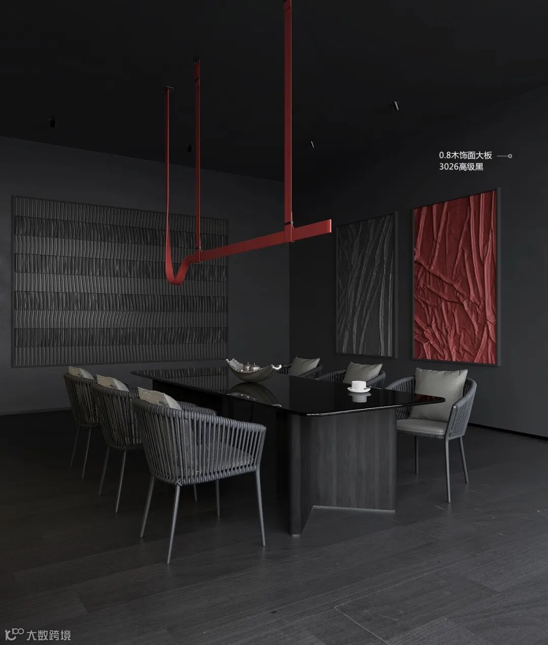 用黑色作为餐厅的主色调,空间增添了几分神秘感,酒红色+深灰的餐椅点缀空间,提升空间氛围又不乏时尚感。3026高级黑木饰面,再搭配些鲜明的色彩加以修饰,空间更有活力。它的神秘可以接受一切搭配,不经意间就能产生意想不到的效果,从而与它与生俱来的霸气与魅惑。