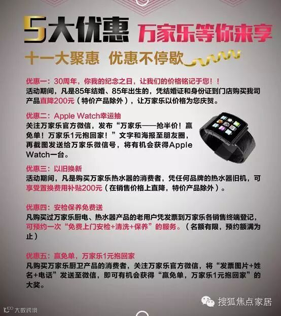 十一促销季,万家乐玩转十一大促风暴。万家乐携手国美、苏宁,开启疯狂促销盛宴,以旧换新,安检保养、《夏洛特烦恼》电影票统统免费送,更有Apple Watchin幸运抽,抢半价、赢免单,万家乐产品还有机会1元抱回家!