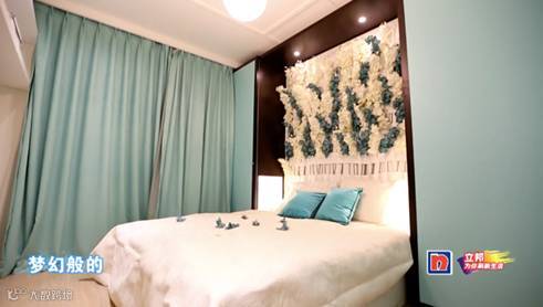 最重头的就是小董和小魏的卧室了,传说中梦幻的婚房终于露出了面孔,梦幻的色彩,独立的卫生间和洗手台,拉开窗帘是落地床,白天的采光也变得十分通透。