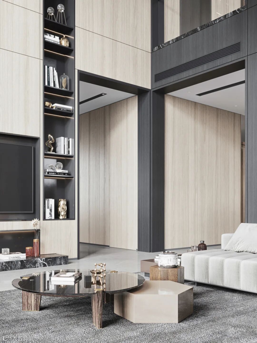 这是一套现代轻奢的私宅别墅,由3021暖白、8021摩卡木、8019橡木竖纹量身定做,打造出独一无二的家!深与浅、明与暗,配合默契。木色加局部撞色,嵌入灯线烘托出空间沉着笃定又不失优雅的高级气质。