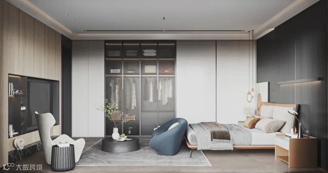 嵌入式的柜体设计,用半透明,半关闭的橱柜--3021暖白柜门搭配,衣柜使用性更强,视觉上也更具美感。