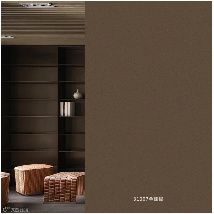 31007金棕榈细腻的磨砂质感,沉稳棕榈色调的碰撞融合,将满满的时尚大气与雅致诗意装点其上,木质的墙面彰显居室的华贵,而安稳沉静的深色调为这种华丽敷上一层低调的肌理,打造百分百的格调和品味。