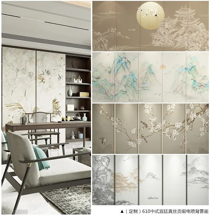 610真丝贡缎画,缎面的柔光丝滑,自带贵气和时髦精致的美感和那一份耐人寻味的高级诱惑,一出场就已赢得全场目光。自带高雅光泽的电喷背景画,竹木纤维+真丝缎面布,环保阻燃,防水,可折弯,是中式风格的优选材料。