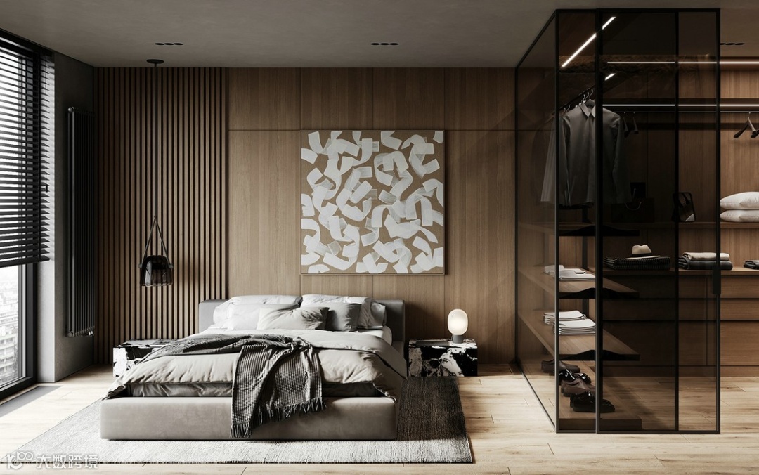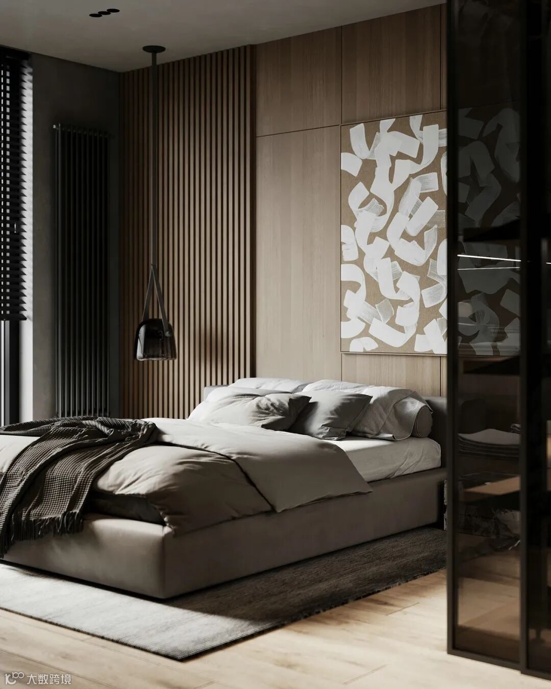 卧室本意就是干净、明亮、舒适的代表,卧室床头背景墙,满墙以经典橡木木纹主色调,半边用格栅做出完美造型,营造出一种放松舒适的睡眠氛围。木纹是贴近自然的最好诠释。与自然相融合,让身心得到清净、自由、舒适。