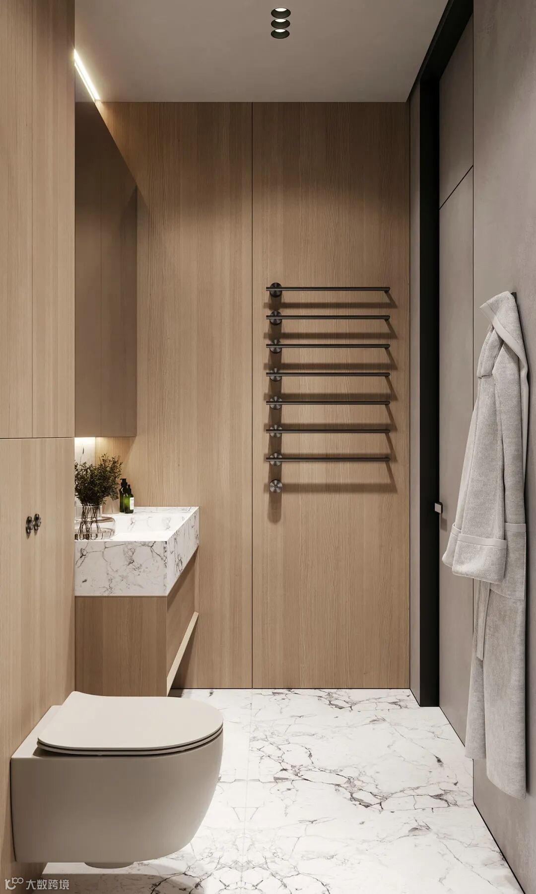 经典橡木饰面搭配灰白色调仿岩板的干湿分区洗手间,很有肌理感,木纹再加入跳跃的亮色加以点缀,将轻奢的气质最大化彰显。从工艺到实践,增强自然的艺术。在纹理上,用属于自然本身的元素,创建新美学的色彩。