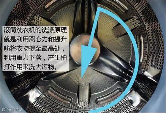 滚筒洗衣机:在洗衣时,滚筒会不断滚动,桶内衣物随之被带动到高处,再随重力摔下,模拟人们用棍棒摔打衣物的动作,配合洗衣液/洗衣粉和水的共同作用来清理衣物。