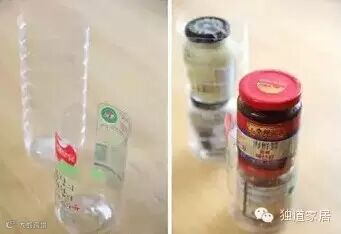 ▼解决办法:找几个大容量的矿泉水瓶、饮料瓶,剪掉瓶盖部分,就变成了收纳容器。再把调料罐摞起来放进去,就不怕倒了▼