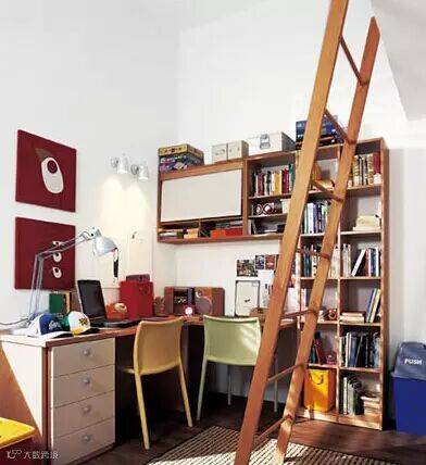 制作成“L”形的书架可以节省两个孩子的生活空间,并且在功能上照样可以满足他们存放各种学习工具的需要,书架顶上的空间还能加以利用。书桌一侧的抽屉柜必不可少,可以将学习时常用的文具等放在里面,便于取用。
