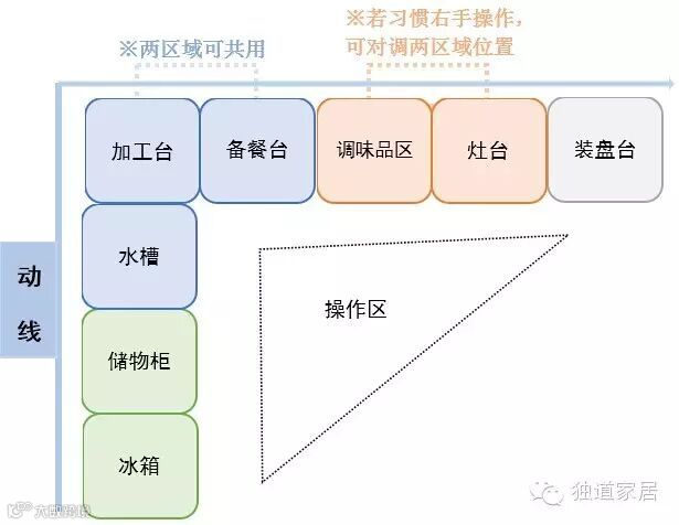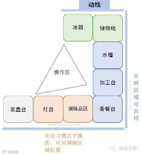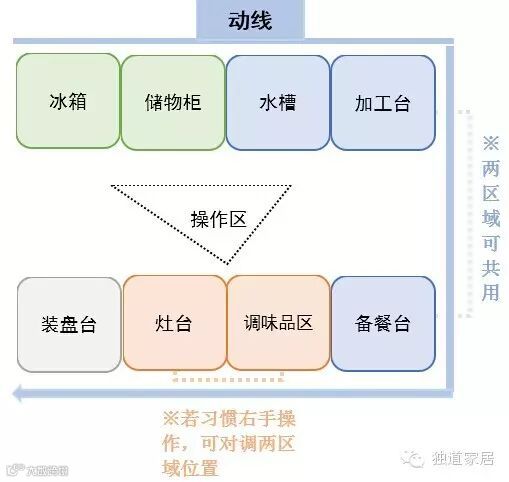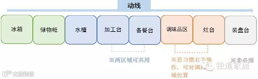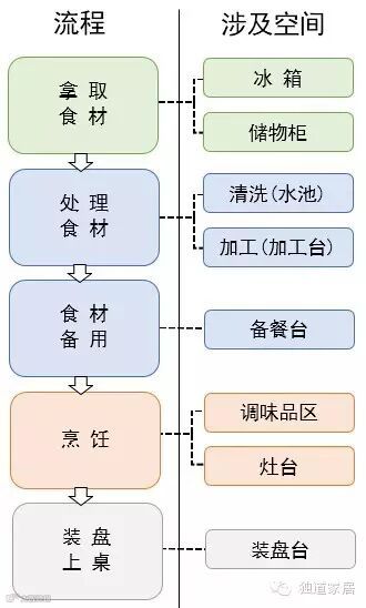 上图流程可分三大块:储物、备餐和烹制。按照合理的顺序布置所需空间,就可以有效提升做饭效率。