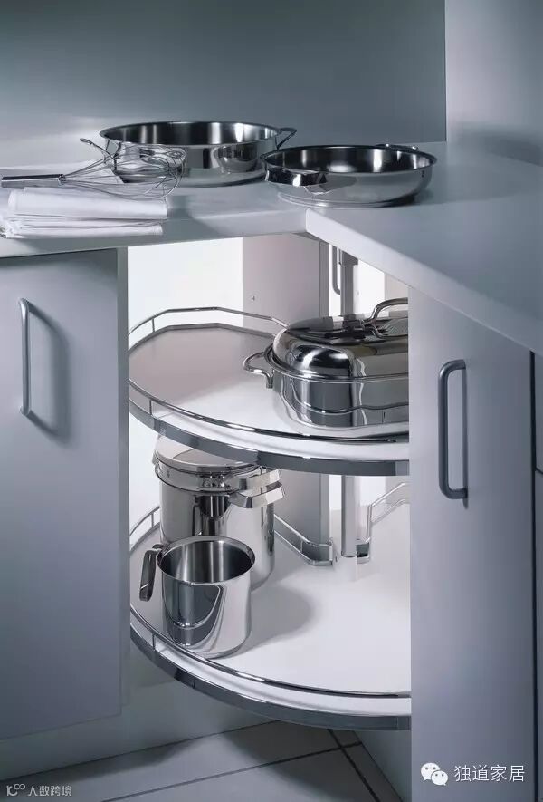 注意:两个拐角空间使用较困难,此处橱柜建议使用L型抽屉,或旋转型抽屉,也可根据需要在拐角处台面上摆放置物架,提高空间利用率。