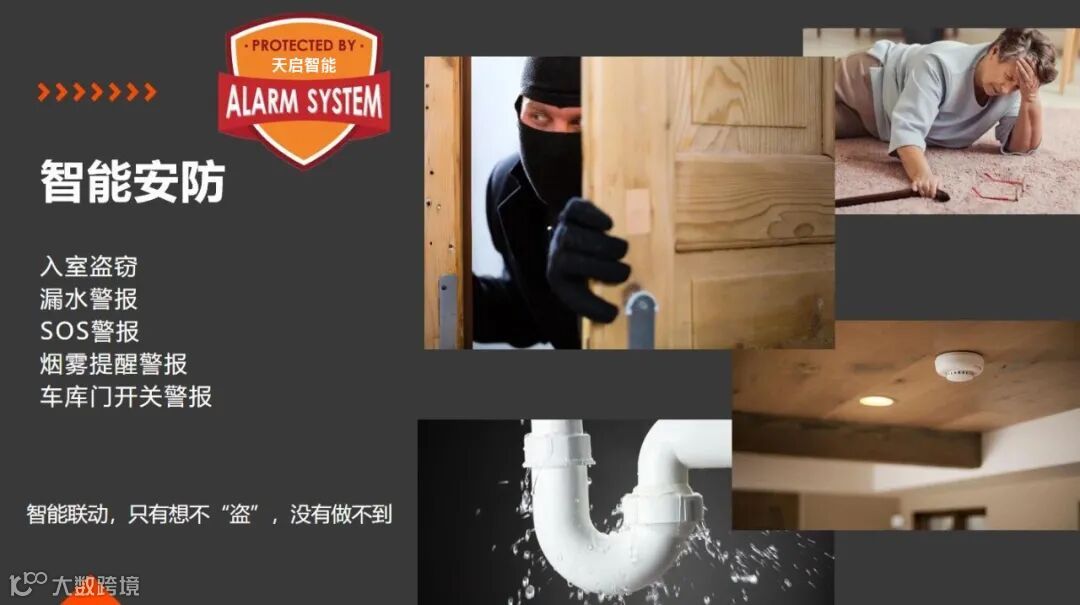 .安全:有非法分子接近您的住宅时,安防监控系统会发出报警声,并自动发送报警信息给屋主。当屋子有漏水、燃气泄漏等感应器会自动发送警报通知并且自动关闭阀门。