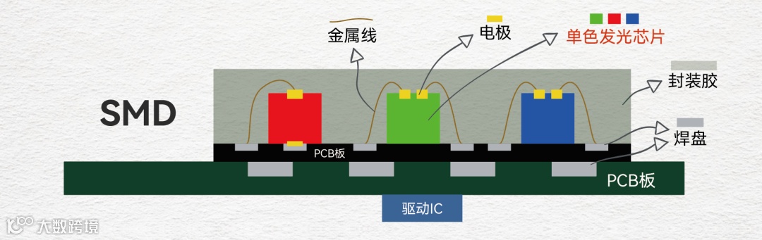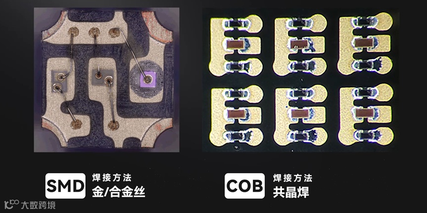 COB全称Chip on Board,即板上芯片封装技术,与之相对的是传统SMD(Surface Mounted Devices)即表贴封装器件技术。