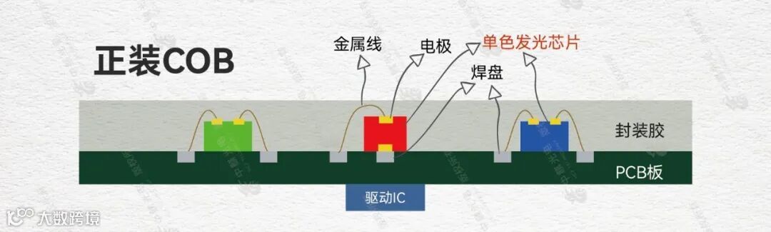 正装COB 的RGB三颗芯片均是正装LED芯片封装在PCB板上。