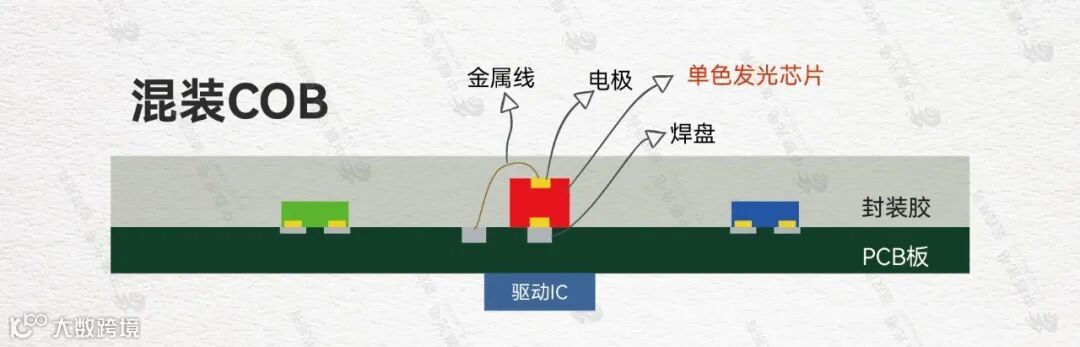混装COB,即RGB三颗芯片采用正、倒装芯片混装的形式封装在PCB上。如常见的“两倒一正”就是采用了1颗正装红光芯片与2颗倒装蓝绿光芯片的组合。